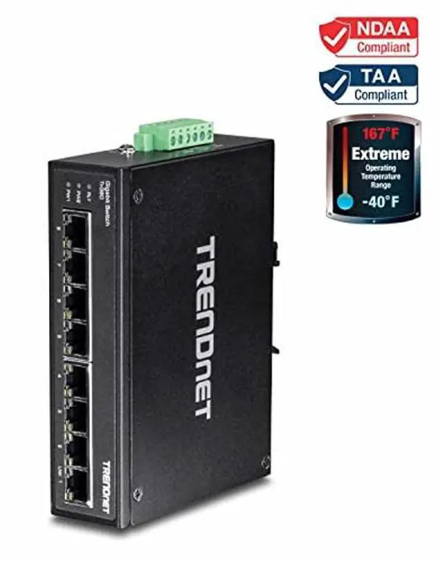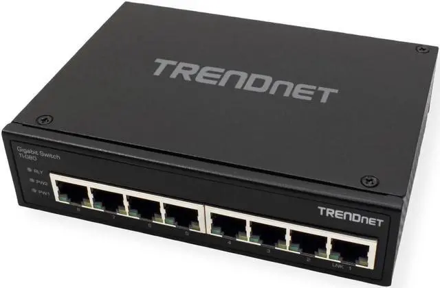 TRENDnet's TI-G80 is a reliable IP30 unmanaged DIN-rail switch with hardened components rated for extreme industrial environments. It offers 8 Gigabit ports and a 16 Gbps switching capacity. Redundant power inputs (power adapter sold separately: TI-M6024) and a power failure alarm output trigger support zero downtime applications.