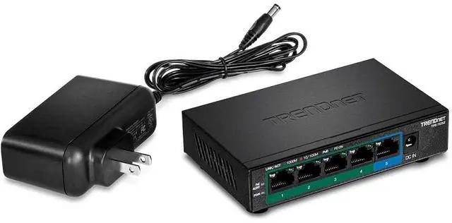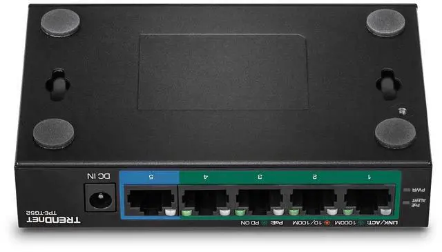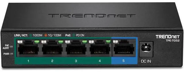 TRENDnet's 5-Port Gigabit PoE+ Switch, model TPE-TG52, reduces equipment and installation costs by delivering data and power over existing Ethernet cables. With PoE technology, users only need one set of cables to deliver both data and power. This compact network switch features four gigabit PoE+ ports and one gigabit port, with a 32W total PoE power budget. The TPE-TG52 PoE+ switch allows you to network PoE devices, such as wireless access points, IP cameras, VoIP phones, IP video encoders, access controls, and more. It features a fanless design, and has a convenient option for wall mounting.