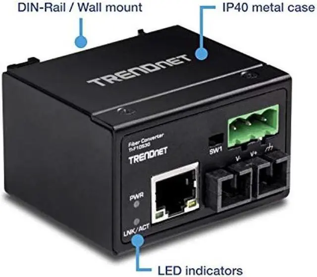 TRENDnet's TI-F10S30 is a compact IP40 rated 100Base-FX fiber converter with hardened components rated for extreme industrial environments. It accommodates long distance networking with 100Base-FX Single-Mode fiber over distances of up to 30 km ( 18.6 miles). Both DIN-rail and wall mount hardware is included.