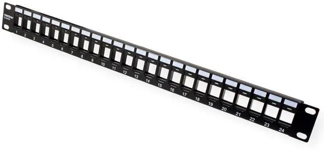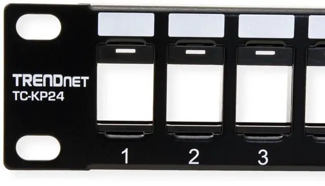 TRENDnet s 24-Port Blank Keystone 1U Patch Panel, model TC-KP24, is designed for use with TRENDnet s Cat6 keystone jacks (TC-K25C6 and TC-K50C6). When used together, they create a patch panel solution suitable for gigabit and 10G Copper Ethernet network applications. 24-Port24-Port blank keystone 1U patch panel is designed for use with TREND net s Cat6 keystone jacks (sold separately). Hardware Design 19 1U sturdy metal rackmount hardware design. Connectivity Perfect for high-speed gigabit and 10G Copper Ethernet network applications when used with TREND net s Cat6 keystone jacks (sold separately). PACKAGE CONTENTS* TC-KP24* Quick Installation Guide