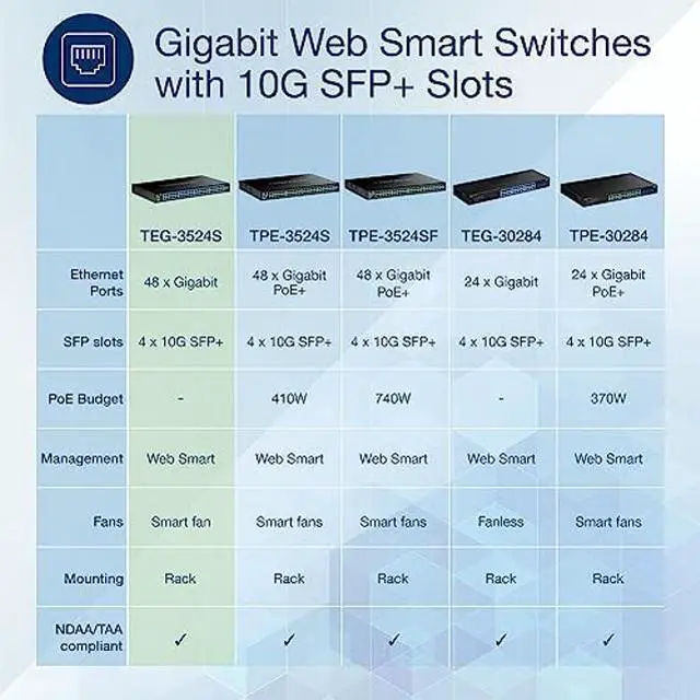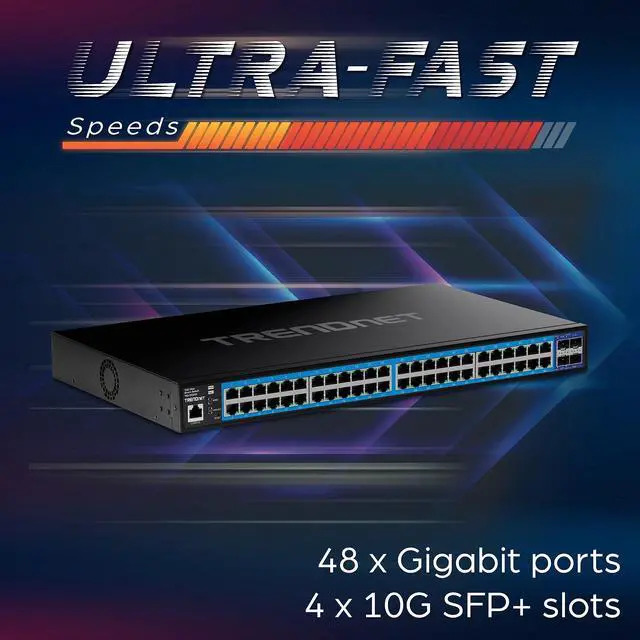 These gigabit managed switches come equipped with RJ-45 ports that provide gigabit speeds over your existing Cat5e or better cabling. The gigabit managed switches also each offer four dedicated 10G SFP+ ports for high-speed network connections, providing a cost-effective solution in adding 10G link capability to an SMB network. The strategic design of the switches lowers energy consumption and eliminates distracting operating noise. TRENDnets reliable managed switches with SFP+ ports offer cost-effective solutions to increase your networks throughput.