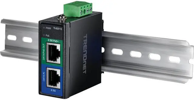 TRENDnets Industrial 2.5G PoE+ Injector, model TI-IG215, allows users to add PoE+ power to a non-PoE 2.5G switch. Connect the 2.5G PoE+ injector to a non-PoE switch, and then run an Ethernet cable up to 100 meters (328 ft. ) to network a PoE/PoE+ device. This multi-gig industrial PoE+ injector supplies up to 30W of power to a PoE device. The fanless design conveniently eliminates operating noise and lowers energy consumption. The 2.5G PoE+ injector is equipped with an IP50-rated metal enclosure, designed to withstand a high degree of vibration and shock, while operating within an extreme temperature range of -40° 75° C (-40° 167° F) for harsh industrial environments.