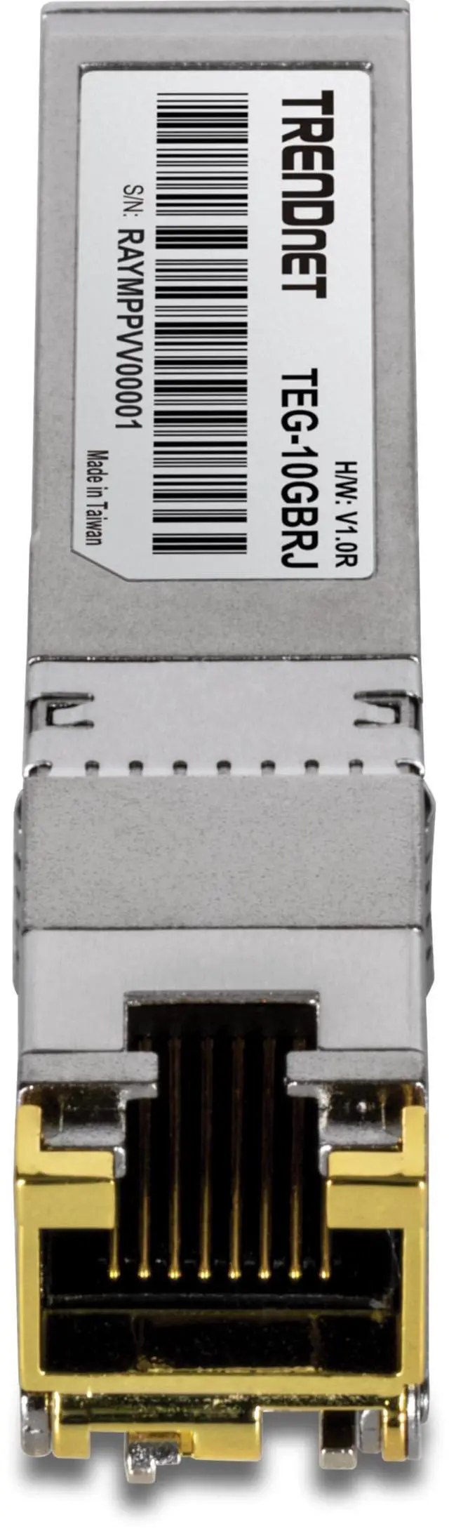 TRENDnets 2-Pack 10G RJ45 Copper SFP+ Module, model TEG-10GBRJ/2, converts standard SFP+ ports into an RJ45 multi gigabit port for additional high-speed copper connectivity. These 10G copper SFP+ modules work with standard SFP+ ports commonly found in network switches and fiber media converters. Save on equipment costs by repurposing a switchs unused SFP+ ports for reliable copper connectivity with TRENDnets 10G copper SFP+ modules.
