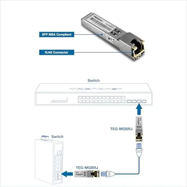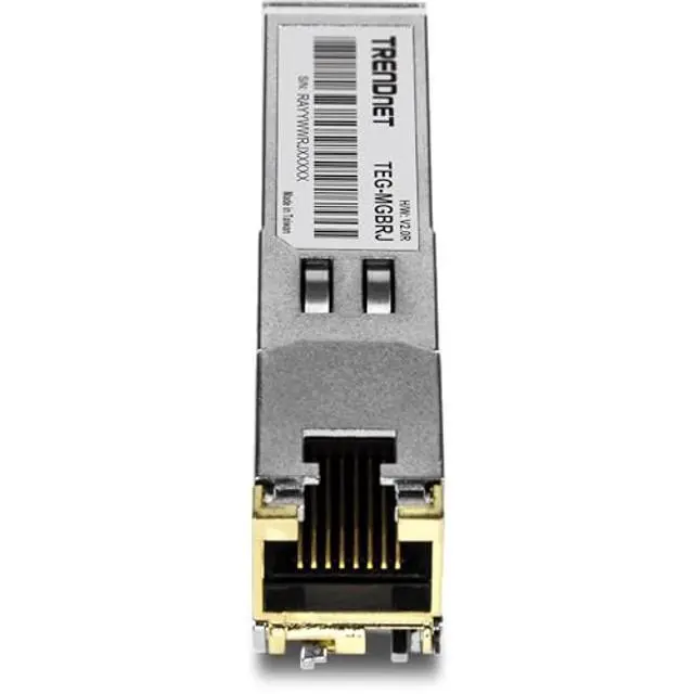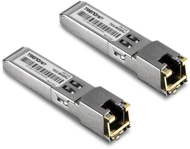 TRENDnets 2-Pack 1000BASE-T RJ45 Copper SFP Module, model TEG-MGBRJ/2, converts a standard SFP port into a RJ45 gigabit port for additional copper connectivity. These SFP modules work with standard SFP ports commonly found in network switches and fiber media converters. Save on equipment costs by repurposing a switchs unused SFP ports for copper connectivity.