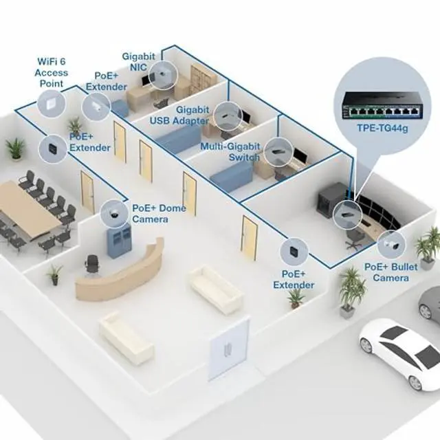 TRENDnets 8-Port Gigabit PoE+ Switch, model TPE-TG44g, reduces equipment and installation costs by delivering data and power over existing Ethernet cables. This unmanaged switch offers four Gigabit PoE+ and four Gigabit non-PoE ports. The PoE+ standard supplies up to 30W of power per port for devices, such as wireless access points, PTZ cameras, or VoIP telephony systems. Auto sensing technology delivers 30W to 802.3 at PoE+ devices, 15.4W to 802.3 af PoE devices, and only data to non-PoE devices. Boost office efficiency and reduce network congestion with a total switching capacity of 16Gbps.