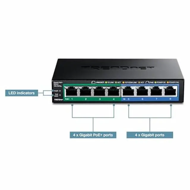 LED indicators display device status for efficient troubleshooting. This switch comes in a sturdy metal case and quickly adds PoE+, PoE, and non-PoE devices to your network.
