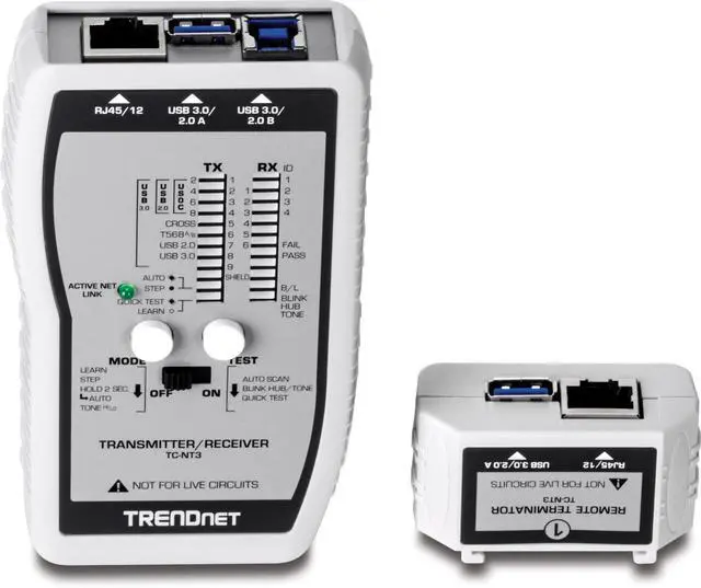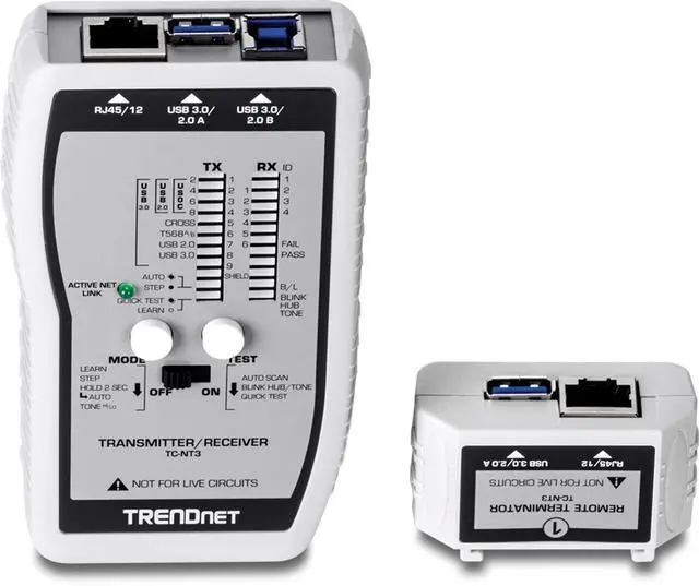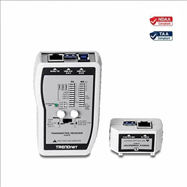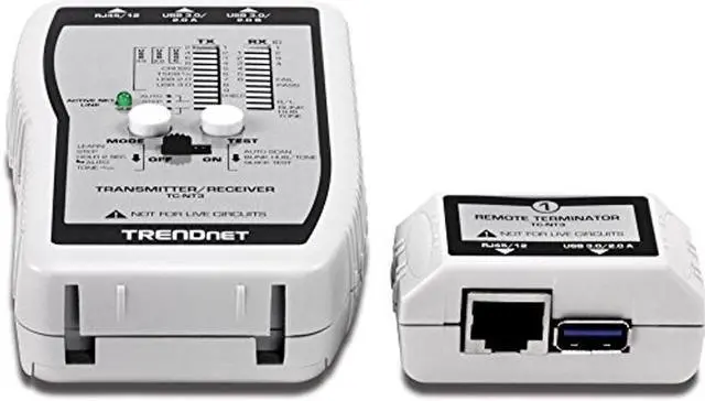 TRENDnet's VDV & USB Cable Tester, model TC-NT3, is a comprehensive cable tester for network professionals. It accurately tests a variety of voice, data, video, and USB cables. The TC-NT3 identifies proper, severed, short circuit, and cross connected pins for cable distances of up to 300 meters (1, 000 ft. ). Quick Test mode issues a pass/fail for large test batches. All components fit into a convenient travel case.