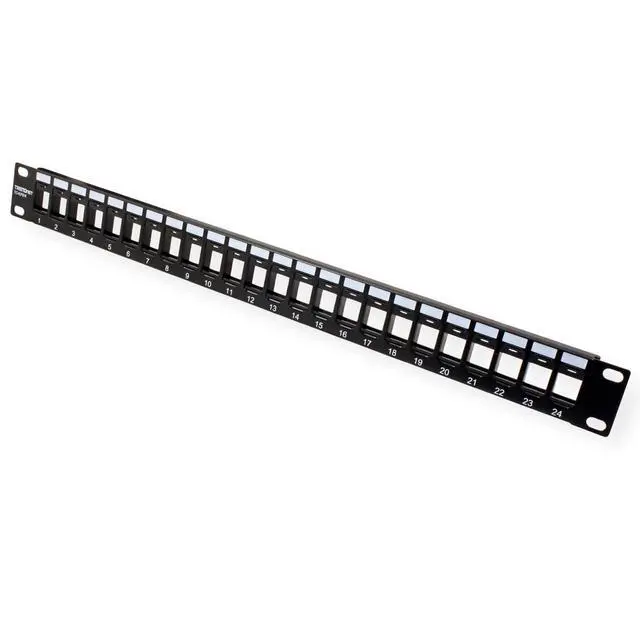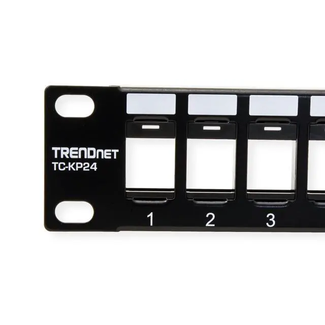 TRENDnet s 24-Port Blank Keystone 1U Patch Panel, model TC-KP24, is designed for use with TRENDnet s Cat6 keystone jacks (TC-K25C6 and TC-K50C6). When used together, they create a patch panel solution suitable for gigabit and 10G Copper Ethernet network applications. 24-Port24-Port blank keystone 1U patch panel is designed for use with TREND net s Cat6 keystone jacks (sold separately). Hardware Design 19 1U sturdy metal rackmount hardware design. Connectivity Perfect for high-speed gigabit and 10G Copper Ethernet network applications when used with TREND net s Cat6 keystone jacks (sold separately). PACKAGE CONTENTS* TC-KP24* Quick Installation Guide