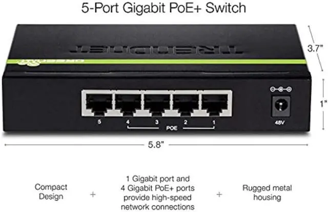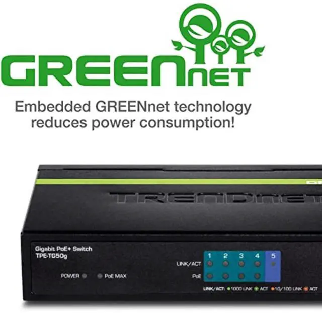 TRENDnets 5-Port Gigabit PoE+ Switch, model TPE-TG50g, delivers data and power over existing Ethernet cables to Power over Ethernet (PoE) devices, such as access points and IP cameras. It supports both PoE and PoE+ devices with a 31W PoE power budget. Easily install this compact sturdy metal switch for reliable high-speed PoE networking.