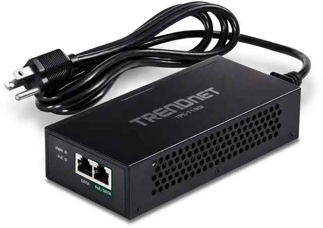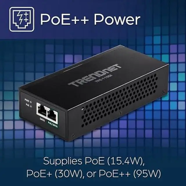 TRENDnet's Gigabit PoE++ Injector, model TPE-119GI, is an 802.3 bt PoE injector that combines electrical power with a gigabit network connection to produce a high-powered 95W PoE++ network signal. Auto-sensing technology conveniently delivers the correct wattage needed to power your PoE, PoE+, and PoE++ devices. Connect the Gigabit PoE++ injector to a non-PoE switch, and then run an Ethernet cable with data + power to network a PoE device up to 100 meters (328 ft. ) away. Network PoE devices such as wireless access points, IP cameras, VoIP phone systems, IPTV decoders, access controls, and more with this 802.3 btbt PoE injector.