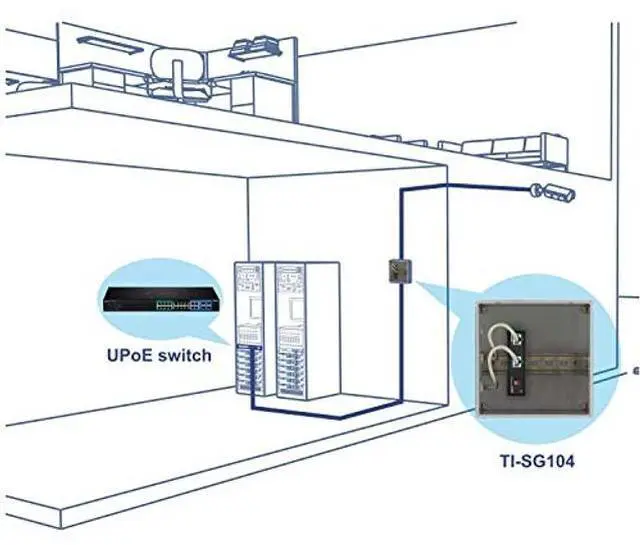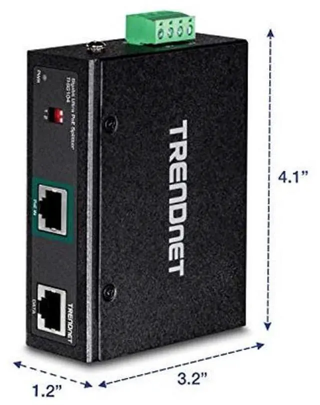 TRENDnet's Industrial Gigabit UPoE Splitter, model TI-SG104, networks a non-PoE device by using a Gigabit Ultra PoE connection and splitting it into separate power and gigabit data sources. The industrial gigabit UPoE splitter can power to up to two devices from a single UPoE source. A convenient DIP switch adjusts output power to 12V, 16V, 24V, or 48V in order to match power requirements for non-PoE devices. The UPoE splitter's dual DC power output provides greater device compatibility.