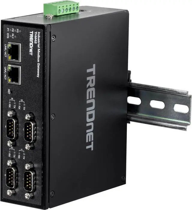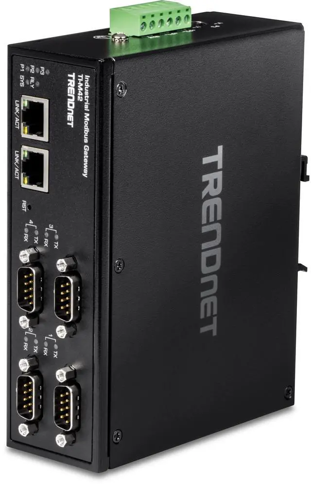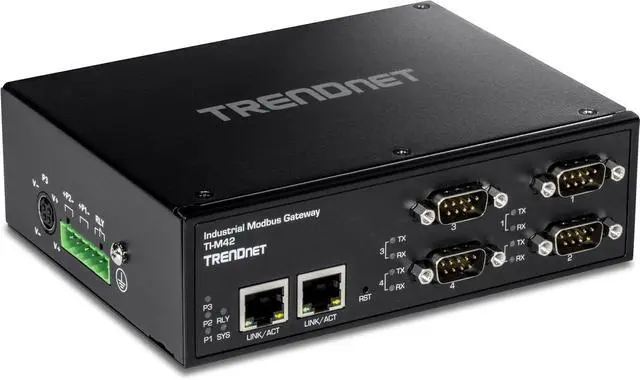 TRENDnets Industrial Modbus Gateway, model TI-M40, provides four port serial connections, and two fast Ethernet ports at distances up to 100m (328 ft. ) using Cat5e cabling. This industrial gateway allows users to connect four modbus serial devices to a network.