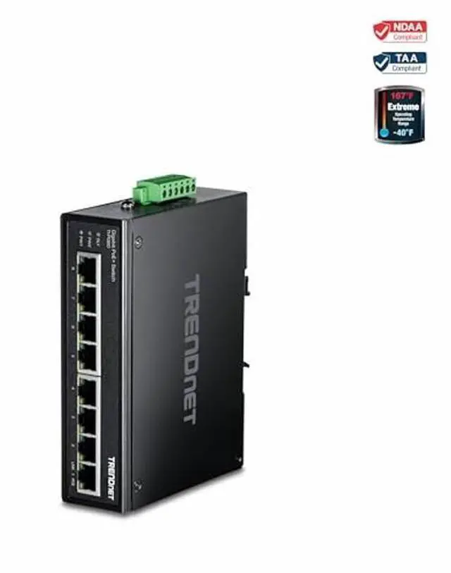 TRENDnets 8-Port Industrial Gigabit PoE+ DIN-Rail Switch, model TI-PG80, features a rugged IP50 rated metal enclosure for industrial environments. This industrial unmanaged PoE+ switch is designed to withstand a high degree of vibration and shock, while operating in both high and low temperatures within -40 75 C (-40 167 F). Redundant power inputs with overload current protection minimize network downtime. Installers and integrators can save on equipment costs and reduce installation time with TRENDnets Industrial Gigabit PoE+ Switch by delivering up to 30W per port of PoE power and data over existing Ethernet cables.