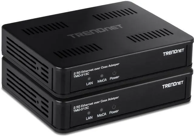 TRENDnets MoCA 2.5G bps Ethernet Over Coax Adapter (2-Pack), model TMO-313C2K, uses your existing coaxial cables to extend a high-speed building-wide Triple Play network throughout your home or office. These compact coax to Ethernet adapters are designed to support MoCA 2.5 deployment for digital TV, high-speed internet, and VoIP single-access subscription service offerings. Compliant with Multimedia over Coax Alliance (MoCA 2.5 ) standards with improved packet error rate technology that delivers consistent voice and video bandwidth with lowered latency.