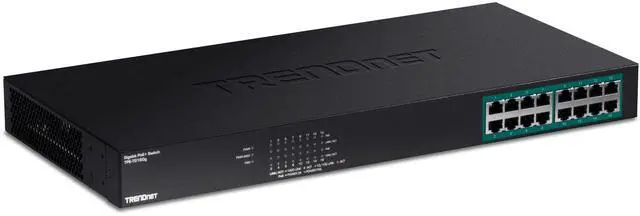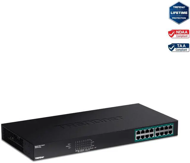 TRENDnets 16-Port Gigabit PoE+ Switch, model TPE-TG160g, offers 16 x Gigabit PoE+ ports, a 32 Gbps switching capacity, and a PoE power budget of 246 Watts. This rugged metal switch comes with a rack mount kit. PoE Camera FlexibilityThe switch recognizes non-PoE, PoE (15. 4 W), and PoE+ (30 W) cameras (or other PoE devices) and supplies the required amount of power automatically. Full PoE Power The large 246 Watt PoE power budget supplies full PoE power to every port, thereby maximizing the number of allowable connected PoE devices.