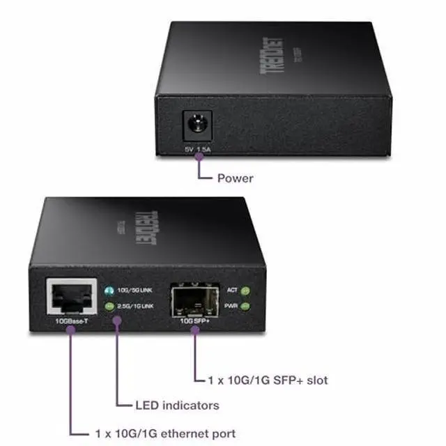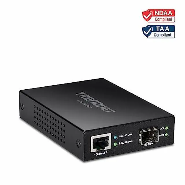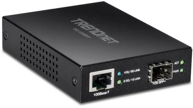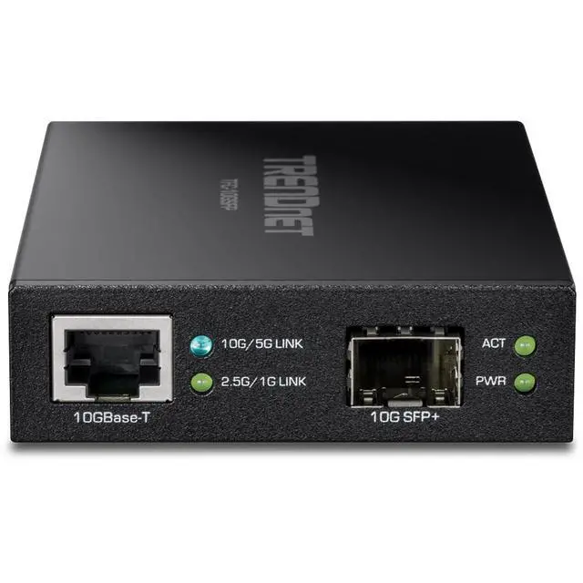 TRENDnets compact 10GBASE-T to SFP Fiber Media Converter, model TFC-10GSFP, converts a 10GBASE-T (Copper 10Gbps) ethernet connection to 10G BASE-SX/LX (Fiber) SFP media connection, and vice versa. The 10GBASE-T RJ-45 port on the 10G SFP+ transceiver supports a full-duplex 10G connection at wire speed. The SFP slot supports both multimode (SX) or single-mode (LX) SFP modules.