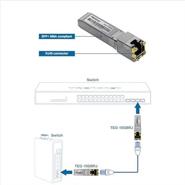 TRENDnets 2-Pack 10G RJ45 Copper SFP+ Module, model TEG-10GBRJ/2, converts standard SFP+ ports into an RJ45 multi gigabit port for additional high-speed copper connectivity. These 10G copper SFP+ modules work with standard SFP+ ports commonly found in network switches and fiber media converters. Save on equipment costs by repurposing a switchs unused SFP+ ports for reliable copper connectivity with TRENDnets 10G copper SFP+ modules.