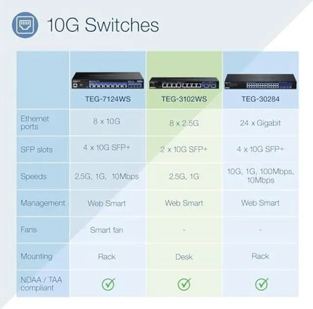 These multi-gigabit managed switches come equipped with 2.5GBASE -T RJ-45 ports that provide higher gigabit speeds capable of up to 2.5G bps over your existing Cat5e or better cabling. The multi-gig managed switches also each offer two dedicated 10G SFP+ slots for high-speed network connections, providing a cost-effective solution in adding 10G link capability to an SMB network. The design of the switches lowers energy consumption and eliminates distracting operating noise. TRENDnets reliable 2.5G managed switches with 10G SFP+ slots offer cost-effective solutions to increase your networks throughput.