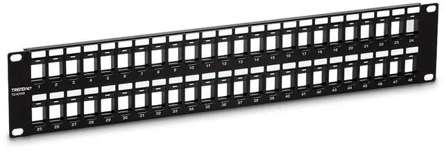 TRENDnets 48-Port Blank Keystone 2U Patch Panel, model TC-KP48, is designed for use with TRENDnets Cat6 keystone jacks (TC-K25C6 and TC-K50C6). When used together, they create an HD keystone patch panel solution suitable for high-speed gigabit network applications. 48-Port 48-Port blank keystone 2U patch panel is designed for use with TRENDnets Cat6 keystone jacks (sold separately). Hardware Design HD keystone patch panel features a 19 2U sturdy metal rackmount hardware design. Connectivity Perfect for high-speed gigabit network applications when used with TRENDnets Cat6 PACKAGE CONTENTS TC-KP48 Quick Installation Guidekeystone jacks (sold separately).