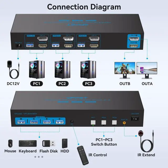 HDMI 2.0 + Displayport 1.4 KVM Switch 2 Monitors 3 Computers USB 3.0 KVM 8K & 4K Swicthes for 3 Computer Share Dual Monitor and 1 Set of Keyboard Mouse Printer and U Disk. Two USB Cables Included.