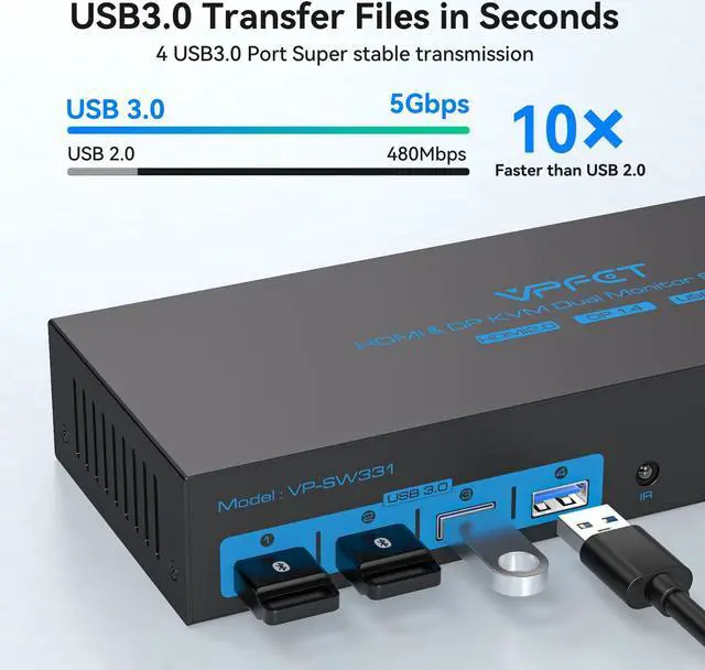 HDMI2.0+ Displayport1.4 KVM Switch 2 Monitors 3 Computers USB 3.0 KVM 8K & 4K Swicthes for 3 Computer Share Dual Monitor and 1 Set of Keyboard Mouse Printer and U Disk. Two USB Cables Included.
