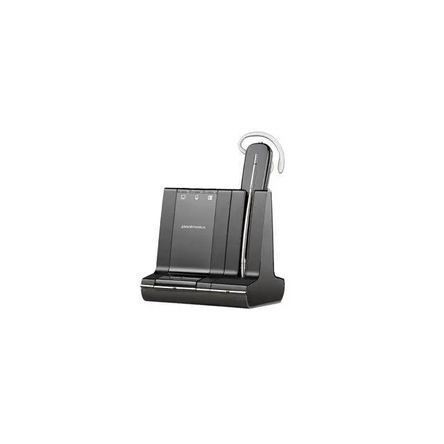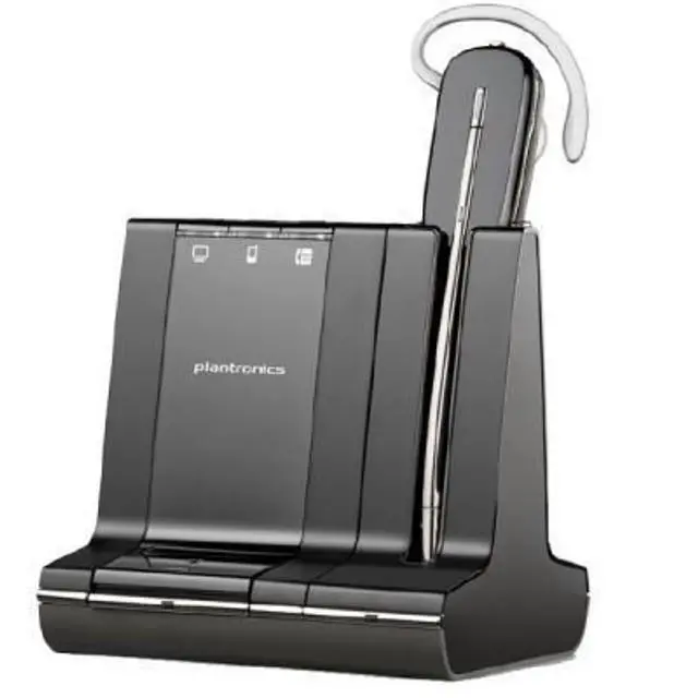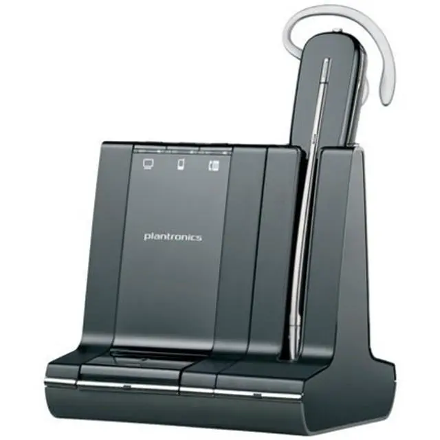 The lightest DECT wireless headset on the market allows you to manage PC, mobile and desk phone communications comfortably and seamlessly. Plantronics Savi 740 lets you easily manage and switch between PC, desk phone, and even mobile calls up to 350 feet from your desk--all from a single wireless headset. Enjoy the comfort of this lightweight DECT headset and experience unlimited talk time with a swappable battery (additional batteries sold separately). The Savi 740 can be worn three different ways: over-the-ear, over-the-head, or behind-the-head to suit your personal style.