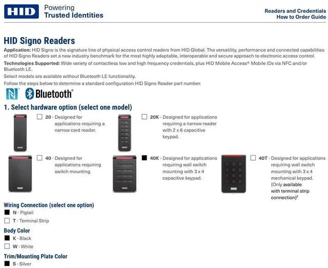 Product Overview THE SIGNATURE LINE OF READERS FROM HID GLOBAL Highly Versatile - Support for the widest range of credential technologies, including HID Mobile Access via native Bluetooth and Near Field Communication (NFC). Unparalleled Performance - Ultra secure storage of cryptographic keys on certified secure element hardware, plus a new surface detection feature that enables the reader to automatically recalibrate and optimize read range performance. Connected to the Future - All readers include out-of-the-box support for Open Supervised Device Protocol (OSDP) for secure bidirectional communication. HID Signo is the signature line of physical access control readers from HID Global.