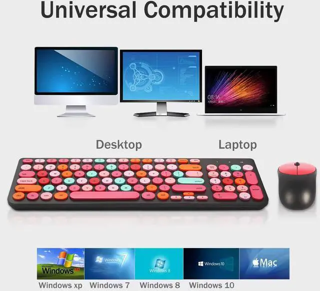 Wireless Keyboard and Mouse Combo, Retro Typewriter Wireless Keyboard with Round Keycaps, 2.4GH z Full-Size USB Cute Mouse for Desktop, Laptop and Computer (Black-Colorful)