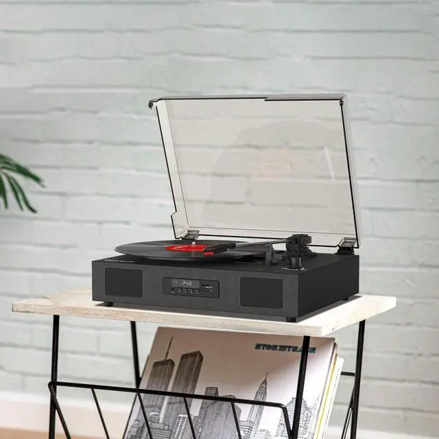 Vinyl Record Player Turntable with Built-in Stereo Speakers, Vintage 3-Speed Turntable for Vinyl Records USB SD Recording with Bluetooth Music Playback, RCA Out and Digital Display, Black