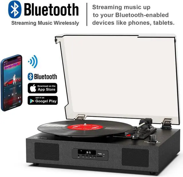 [(BLUETOOTH IN/USB/AUX)] -You can wirelessly connect and streaming music from your Bluetooth devices like your phone or tablet. Plug in your USB/TF card and play audio from built-in stereo speakers. Hook up this vinyl player to your own powered speakers via its RCA ports on the back.