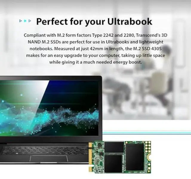 Transcend Ultra compact M. 2 SSD 430S, adopting the SATA III 6GB/s interface and DDR3 DRAM cache, is well-suited to address the high-performance needs and strict size limitations of small form factor devices. By using only high-quality NAND flash and enhanced firmware algorithms, Transcend M. 2 SSD 430S delivers peerless reliability.