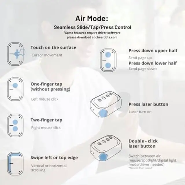 [(Ultimate Presentation Clicker with Laser Pointer)] Cheerdots2 Air Mouse is an ideal assistant to have in your meeting room, classroom, or lecture. It offers two modes of operation: Desktop Mode and Air Mode. In desktop mode, it serves as a regular air mouse with added touchpad features. In Air Mode, it transforms into a handheld smart device controller and professional presentation remote clicker with two content highlighting options. You can tap or slide the surface to move the cursor, slide the side to flip the pages of your presentation and switch between spotlight and digital light to highlight what y