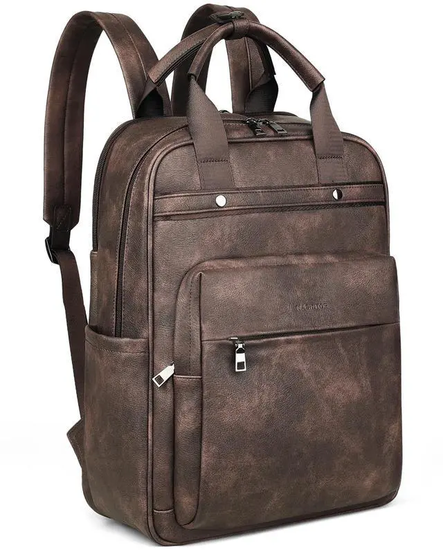 MASINTOR Leather Laptop Backpack for Women, Stylish Computer Backpack College Business Work Shoulder Bags Work and Travel Retro Coffee