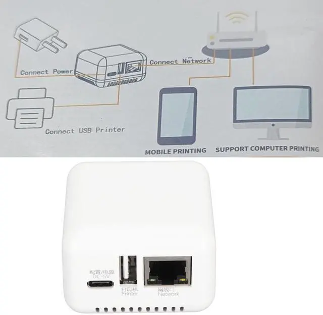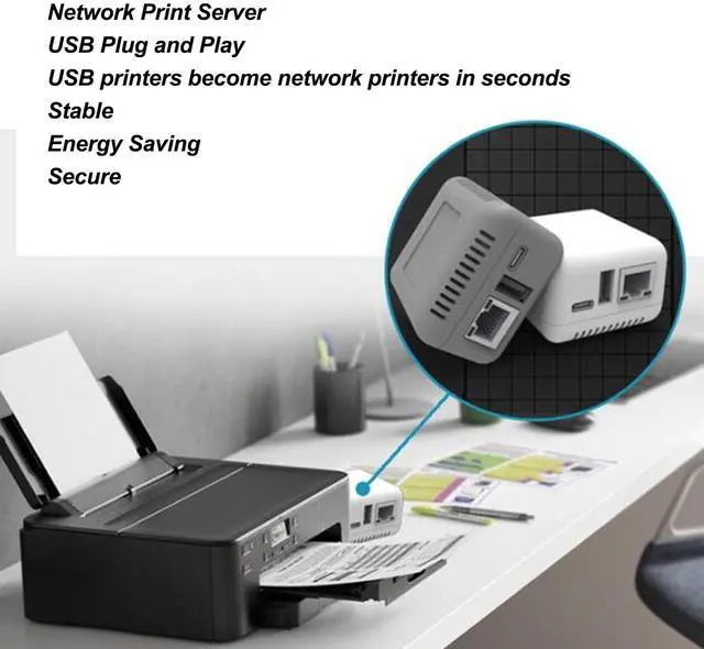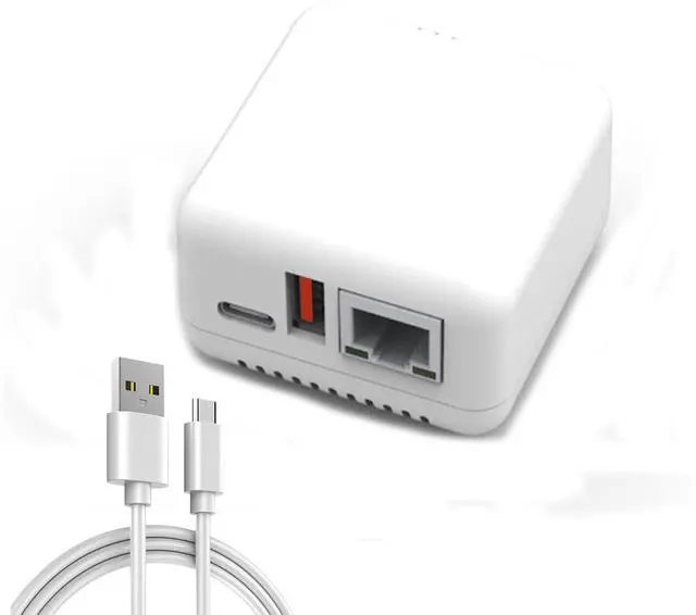 MULTIPLE INTERFACES: Computer print server adapter with Type C power supply port, printer USB connection port, and network cable interface.