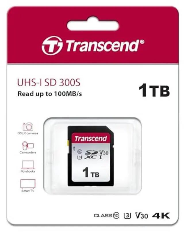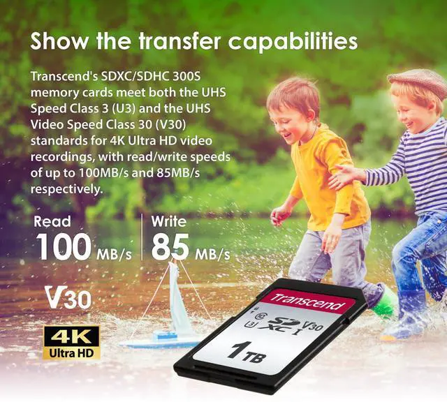 Transcend's SDXC/SDHC 300S memory cards provide the performance and capacity necessary to harness the full power of your UHS-I compliant digital camera or camcorder. In addition to incredible transfer speeds, the cards meet UHS Video Speed Class 30 (V30) standards, allowing for smooth, uninterrupted 4K video capture. *V30 compliance applies only to 128GB-1TB capacity cards.