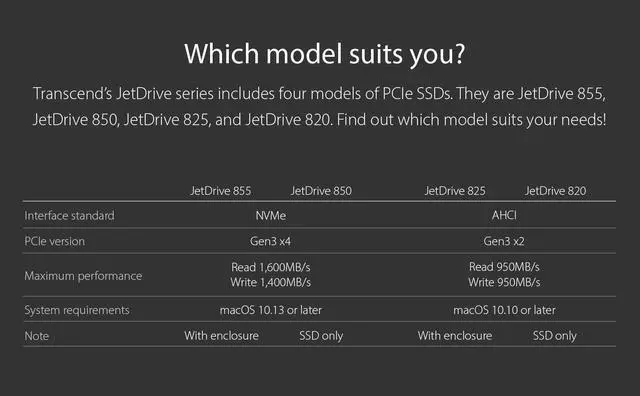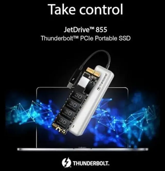 Transcend JetDrive 855 Thunderbolt PCIe portable SSD combines a JetDrive 850 PCIe SSD with a sleek aluminum Thunderbolt enclosure to instantly revitalize your Thunderbolt-equipped MacBook Pro, MacBook Air, Mac mini, or Mac Pro!