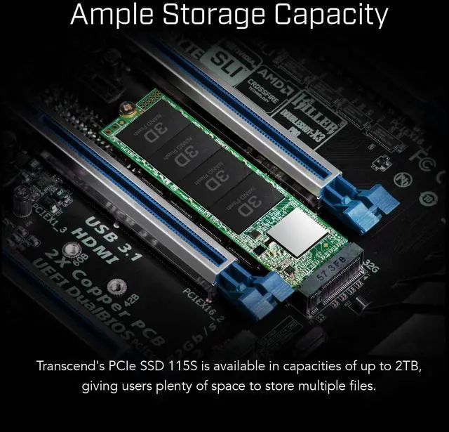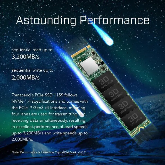 Upgrade your computer performance to a whole new level with Transcend's PCIe SSD 115S! Boasting the slick PCIe Gen 3x4 interface and slim M. 2 2280 size, the PCIe SSD 115S is the perfect speedy and sizable companion for your desktops, laptops, and ultrabooks! ^^ Transcend's PCIe SSD 115S follows NVMe 1.4 specifications and comes with the PCIe Gen3 x4 interface, meaning four lanes are used for transmitting and receiving data simultaneously, resulting in excellent performance of read speeds up to 3, 200MB/s and write speeds up to 2, 000MB/s.