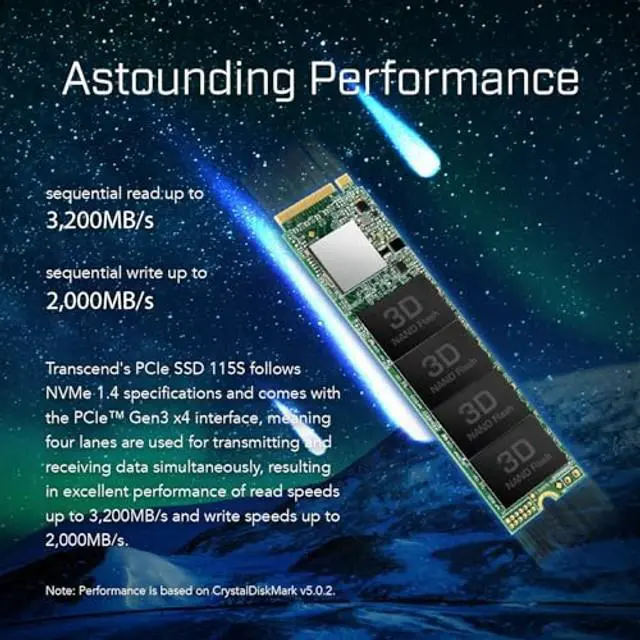 Upgrade your computer performance to a whole new level with Transcend's PCIe SSD 115S! Boasting the slick PCIe Gen 3x4 interface and slim M. 2 2280 size, the PCIe SSD 115S is the perfect speedy and sizable companion for your desktops, laptops, and ultrabooks! ^^ Transcend's PCIe SSD 115S follows NVMe 1.4 specifications and comes with the PCIe Gen3 x4 interface, meaning four lanes are used for transmitting and receiving data simultaneously, resulting in excellent performance of read speeds up to 3, 200MB/s and write speeds up to 2, 000MB/s.
