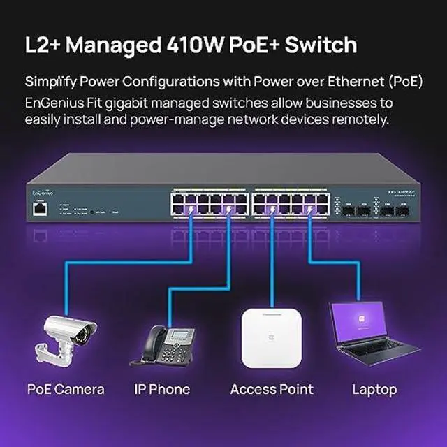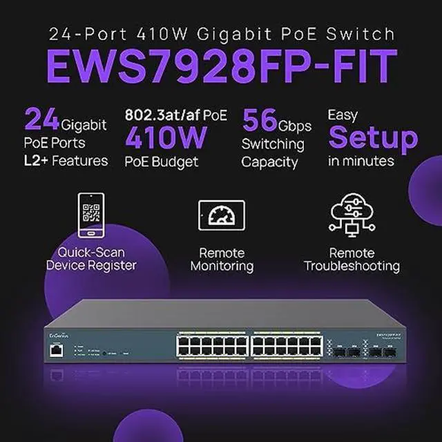 The EnGenius Fit Managed Switch EWS7928FP-FIT is the perfect solution for small business network environments. This 24-port Gigabit PoE+ Layer 2 plus switch comes with a 410W PoE budget, 4 SFP uplink ports, and multiple management options.