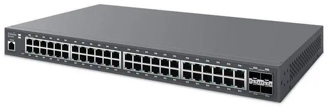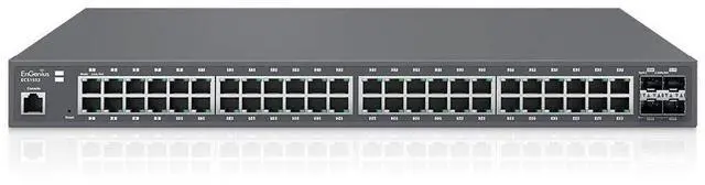 Managed by EnGenius Cloud Platform or EnSky On-premises, (48) 10/100/1000 Mbps Gigabit Ethernet PoE Ports, (4) 10 Gigabit SFP Plus Uplink Ports for Superior Network Performance, Desktop Model Supports Full-Featured Layer 2 Switching, 802.3 af/at Available On All Ports with a Total PoE Budget of 740W