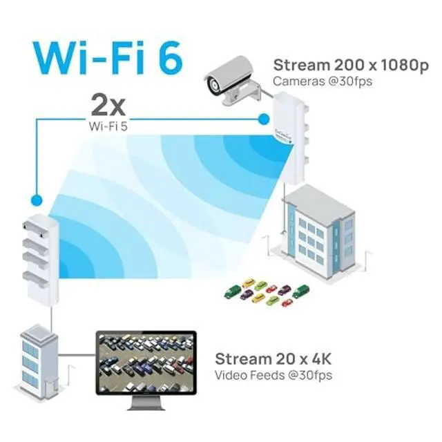 Wi-Fi 6 Speeds up to 1, 200 MbpsEnhanced with Wi-Fi 6 technology enables speed of up to 1, 200 Mbps in the 5-GHz frequency range. ^^ Stable and reliable connectivityImproved signal reception and reliability for clients through beamforming technology. ^^ More power than all the restWi-Fi 6 enables Simultaneous 4K video streaming up to 20 devices or 1080p 30fps camera streaming up to 200 devises. ^^ Efficient Outdoor Performance2x2 directional antennas provides superior outdoor Wi-Fi performance and efficiency. ^^ Extended Wi-Fi CoverageExtended Wi-Fi coverage up to the yard or between buildings with a high transmit power of 26 dBm.