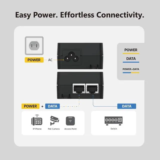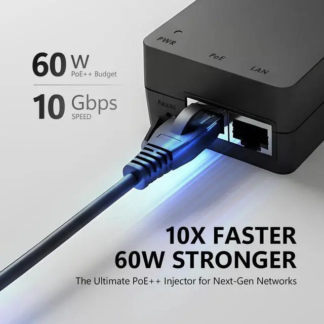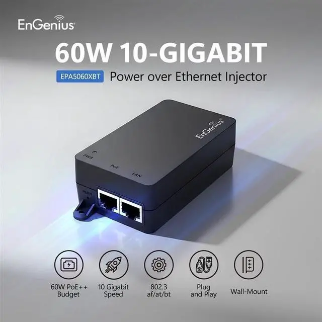 1x 10Gbps data port and 1x 10Gbps PoE++ port (data & power) ^^ Up to 60W of Power over Ethernet ^^ Networking Speeds of up to 10Gbps ^^ Flexible Installation for desktop or surface mounting ^^ Built-in Power Supply ^^ IEEE 802.3 af, 802.3 at, and 802.3 bt Compatible ^^ Ideal for POS Systems, Wi-Fi 6 Access Points, Access Control, PoE Laptops, Nurse Calling, and more