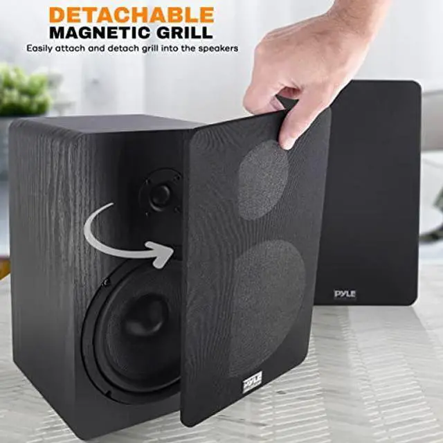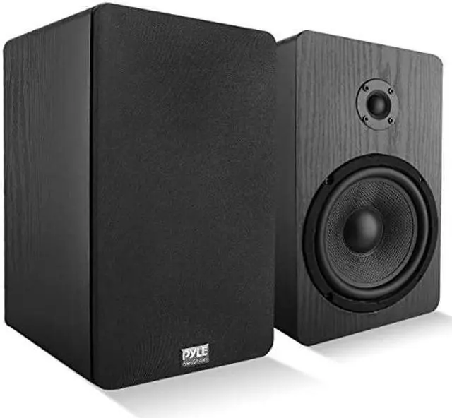 PyleUsa Home Theater Wooden Bookshelf Speakers - Wall-Mountable with 0.75'' Silk Dome Tweeter and Aluminum Voice Coils, Pair, Neat Black Color, Gold Plated 5 Way Binding Post - PSMSP6