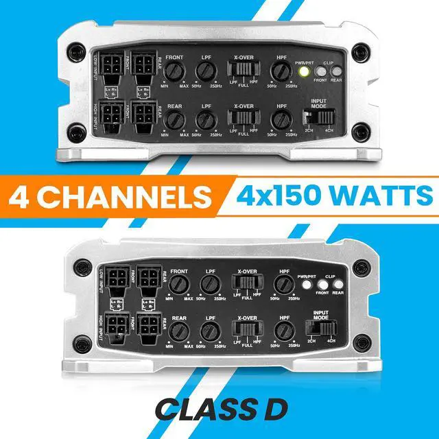 Power Output: 100W x 4 @ 4 ohm @ 1% THD @ 14.4V 150W x 4 @ 2 ohm @ 1% THD @ 14.4V 300W x 2 @ 4 ohm @ 1% THD @ 14.4V (Bridged) MAX