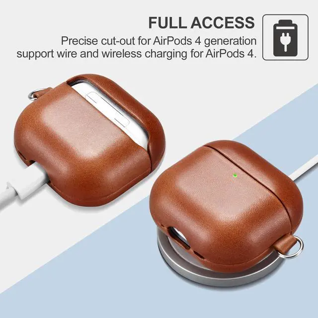 [ 2024 Upgrade Model ] Support Wired and Wireless Charging for AirPods 4 with the case on. The Front LED Light is visible while charging. ^^ [ Genuine Leather ] ICARER AirPods 4 Case made of premium genuine leather. Each piece of leather has its own veins and pores, so the texture of each product you receive is unique. ^^ [ All-Round Protection ] Prevent your device from scrathes, and provide enough protection while bumping or dropping. ^^ [ Convenience ] Portable on the go, carrying your airpods 4 anywhere, Perfect for outdoor activities like walking, hiking, cycling etc.