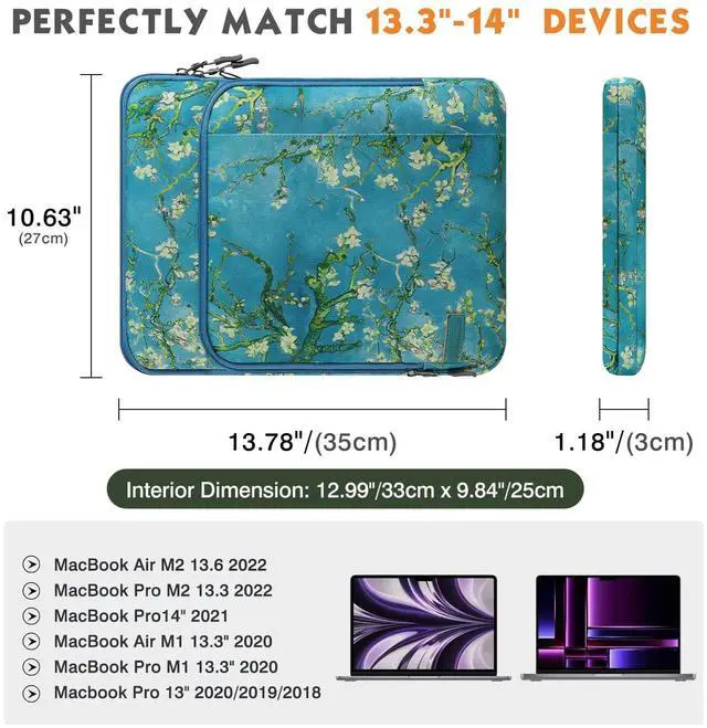 COMPATIBILITY: The sleeve bag is for devices 13.3-14 inch and fits smart keyboard. Fits with New MacBook Pro M3/M3 PRO/M3 MAX 2023, Macbook Pro 14" M2 2023, Macbook Pro 13" M2 2022/Pro M1 Pro/M1 Max 14.2 2021 Macbook Air 13.6" M2 2022/Air 13.3 2019/2020/Pro 13.3 2020, iPad Pro 12.9 M2/M1 2022/2021/2020 (with smart keyboard folio), Galaxy Tab S8+ 12.4", 13" Surface Pro 9 2022, Surface Pro 8, Chromebook Flex 5 13"/Spin 13, Surface Laptop Go 12.4", Surface Pro X/3/4/5/6/7, Surface Book 3.