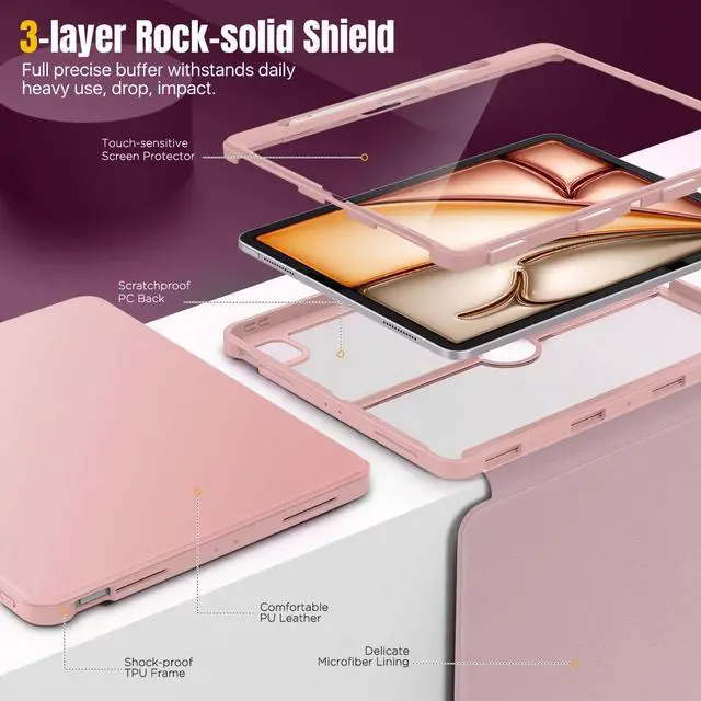 Drop Absorption: iPad Air 13 Inch 2025 Case with transparent hard PC back plate and flexible TPU shock absorbing frame, enhances drop protection to withstand daily drops, bumps and shocks. PU leather exterior and soft microfiber lining protect the iPad air 13 inch 2025 from dust, fingerprints and scratches