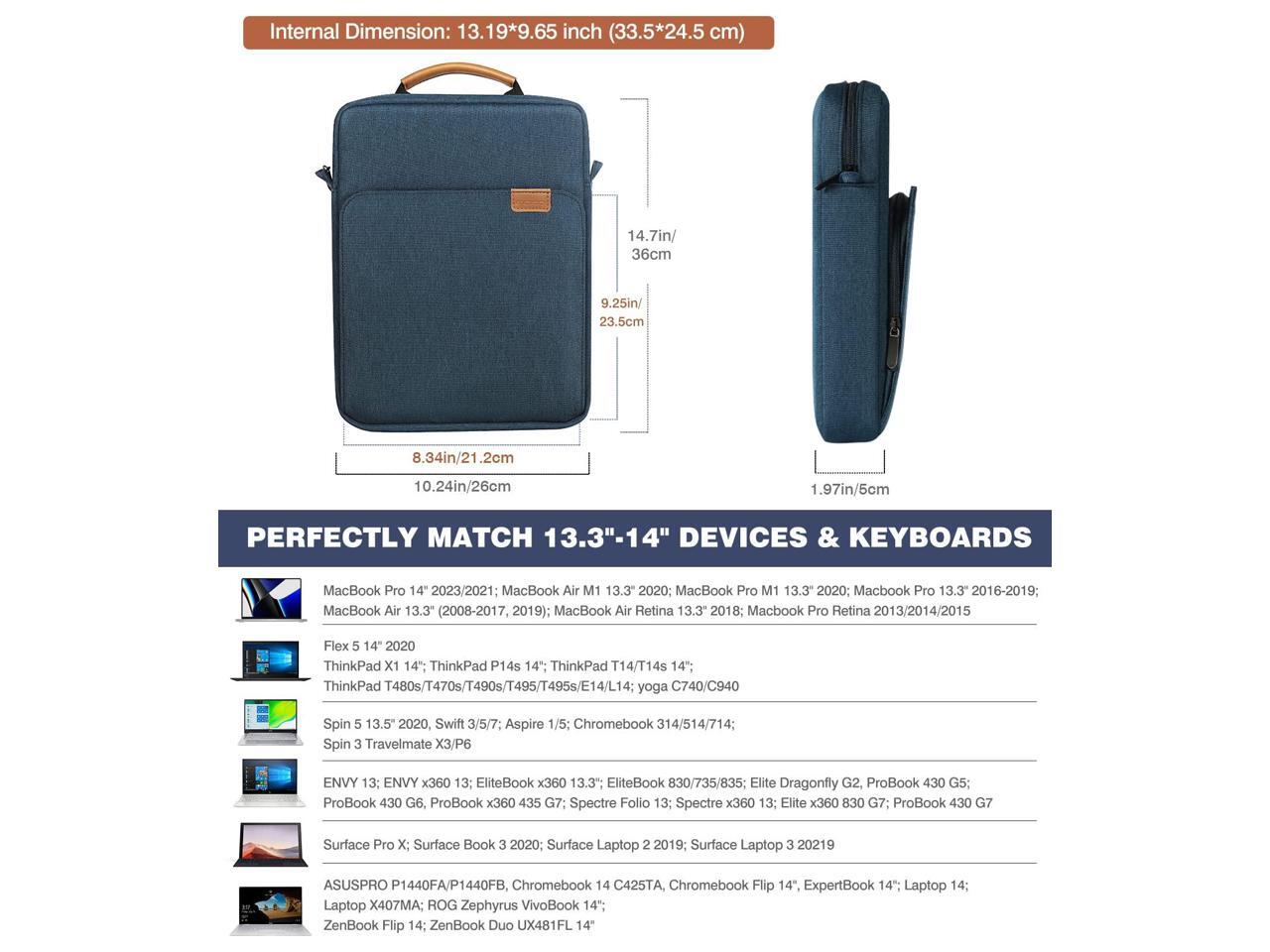 [Compatibility] The sleeve bag is designed for 13.3-14 inch laptop bags. Fits New Macbook Pro M3/M3 PRO/M3 MAX/M2 Pro/M2 Pro Max 14" 2023, Macbook Pro 13" M2 2022/Pro M1 Pro/M1 Max 14.2 2021, New Macbook Air 13.6" M3/M2 2024/2022, Macbook Air Retina 13.3", Macbook Air 13.3", Surface Book 2/3 13.5", Surface Laptop 1/2/3 13.5", Surface Pro 9/8 13", 14Flex 4/Flex 6, Tab S8 Ultra 14.6", Chromebook s330, Yoga 460/P40, ThinkPad E485/T480s, ldeapad 320S/330S/500/510S, Pavilion X360, etc.