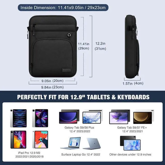 Universal Sleeve- The sleeve tailored for perfect fits most 12.9 inch device, such as New 13-inch iPad Pro M4 2024, New 13-inch iPad Air M2 2024, iPad Pro 12.9 M2 2022/2021/2020/2018, Galaxy Tab S9/S8 Plus 12.4" 2023/2022, Galaxy Tab S9/S7 FE+ 12.4" 2023/2021, Surface Laptop Go 12.4" 2022, Surface Pro 9/8 13" 2022/2020 and other devices under 12.9 inches.