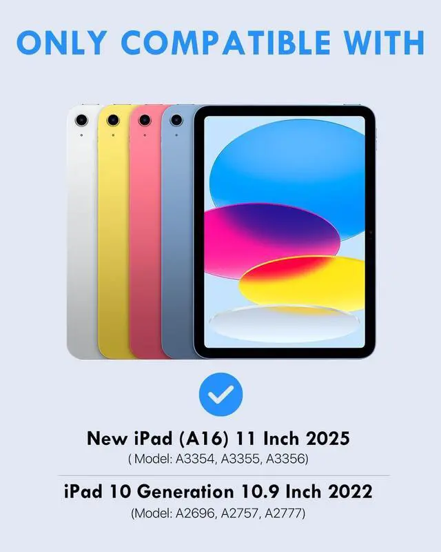 Compatibility: Designed for iPad 11th generation 11 inch 2025 release (A16, Model: A3354, A3355, A3356), iPad 10th generation 10.9 inch 2022 (Model: A2696, A2757, A2777). Including 1 x iPad 11th/10th generation case, 1 x Wireless Keyboard, 1x USB charging cord, 1 x user guide. NOT compatible with any other iPad models